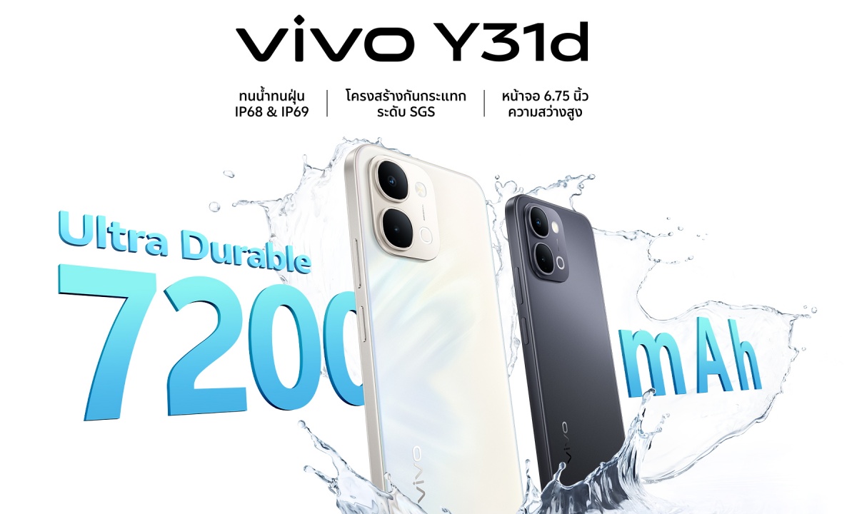 vivo Y31d สมาร์ตโฟนน้องเล็กรุ่นใหม่ล่าสุดจากตระกูล Y series เข้ามาเป็นอีกหนึ่งทางเลือกสำหรับผู้ใช้งานที่มองหาสมาร์ตโฟนที่ผสานความทนทานและความคุ้มค่าไว้ในเครื่องเดียว ออกแบบมาเพื่อรองรับการใช้งานในชีวิตประจำวันได้อย่างมั่นใจ มาพร้อมกับแบตเตอรี่ BlueVolt ความจุสูงถึง 7200mAh ใช้งานได้ยาวนานตลอดวัน พร้อมรองรับ ชาร์จไว 44W และ Bypass Charging ให้ใช้งานได้ต่อเนื่องไม่มีสะดุด ขับเคลื่อนด้วยชิป Snapdragon® 6s Gen 2 (4G) ให้การใช้งานลื่นไหล พร้อมช่วยประหยัดพลังงานมากขึ้น เสริมประสบการณ์ความบันเทิงด้วยหน้าจอขนาดใหญ่ 6.75 นิ้ว รีเฟรชเรต 120Hz และลำโพงสเตอริโอคู่ที่เพิ่มระดับเสียงได้สูงสุดถึง 400% ให้เต็มอิ่มทุกการรับชม มั่นใจยิ่งขึ้นด้วยมาตรฐานทนน้ำทนฝุ่น IP68 และ IP69 และโครงสร้างกันกระแทกรอบด้าน รองรับทุกสถานการณ์ในชีวิตประจำวัน วางจำหน่ายในประเทศไทยแล้วตั้งแต่วันนี้ ในราคาเริ่มต้นเพียง 7,999 บาท