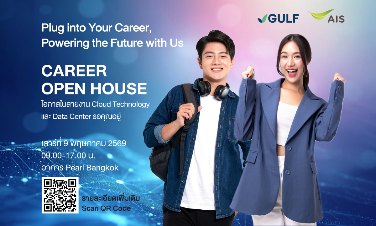 GULF และ AIS เดินหน้าตอกย้ำบทบาทผู้นำด้านโครงสร้างพื้นฐานที่เคียงข้างคนไทย จัดงาน Open House เปิดบ้านครั้งสำคัญเพื่อรับสมัครงานบุคลากรสายเทคหลากหลายสาขา อาทิ Data Center Operation, Cloud Product, Data Analytics, Network Operations Center, Technical Sales, International Connectivity มาร่วมเป็นส่วนหนึ่งของการขับเคลื่อนธุรกิจดิจิทัลที่กำลังขยายตัวอย่างต่อเนื่อง เพื่อรองรับเทคโนโลยีแห่งอนาคต ทั้ง Data Center, Cloud, AI, Digital Infrastructure, Enterprise Digital Services และ Digital Bank สะท้อนถึงทิศทางการเติบโตของ GULF และ AIS ในการยกระดับขีดความสามารถด้านดิจิทัลของประเทศไทยผ่านการพัฒนาโครงสร้างพื้นฐานเทคโนโลยีที่มีความสำคัญต่อภาคธุรกิจอุตสาหกรรมและเศรษฐกิจดิจิทัลในระยะยาว