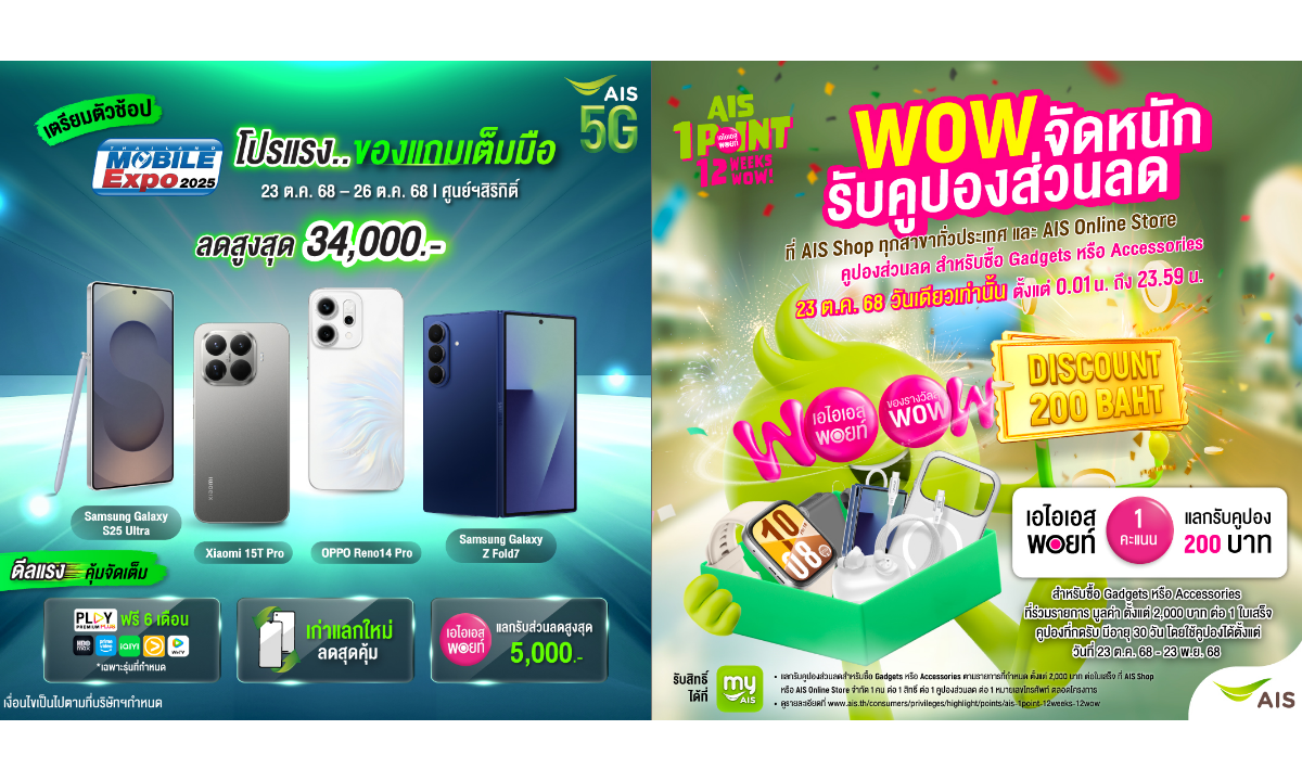 AIS ตอกย้ำการเป็นศูนย์รวมด้านดิจิทัลไลฟ์สไตล์แบบครบวงจรเติมเต็มทุกประสบการณ์ด้วยสมาร์ทโฟนและไลฟ์สไตล์ดิจิทัลพร้อมส่งมอบทุกโซลูชันส์และความสุขส่งท้ายปี 2025 อย่างยิ่งใหญ่ ด้วยแคมเปญโปรโมชั่นสุดร้อนแรงแห่งปี ในงานมหกรรมมือถือที่ใหญ่ที่สุดในประเทศ Thailand Mobile Expo 2025 ที่จัดขึ้นระหว่างวันที่ 23 – 26 ตุลาคม 2568 ณ บูธ PL10 ศูนย์การประชุมแห่งชาติสิริกิติ์ จัดเต็มกว่าที่เคย ดีลสมาร์ทโฟนตัวท็อป อาทิ iPhone, Samsung, Xiaomi และ OPPO ลดแรงที่สุดแห่งปีสูงสุด 34,000 บาท และเนื่องในโอกาสฉลอง 35 ปี ขอมอบความว้าว เพียงใช้ AIS Points 1 คะแนน แลกรับส่วนลด 200 บาท สำหรับซื้อสินค้ากลุ่ม Gadget หรือ Accessories มูลค่า 2,000 บาท ต่อใบเสร็จ พร้อมเปิดตัวฟีเจอร์ใหม่กล้องอัจฉริยะ AiCAM และดีไวซ์สุดล้ำระดับเทพ และมากกว่าการซื้อสมาร์ทโฟน ลูกค้ายังได้รับสิทธิพิเศษชมความบันเทิงฟรี! ด้วย Entertainment Platform อย่าง AIS PLAY ที่รวมที่สุดแห่งความบันเทิงและกีฬา ดูพรีเมียร์ลีกสด ครบทุกแมตช์ นาน 3 เดือน และ Play Premium Plus สนุกเต็มแมกซ์ กับ 5 แอปดัง นาน 6 เดือน* เฉพาะรุ่นที่กำหนด เติมเต็มทั้งสมาร์ทโฟนและไลฟ์สไตล์ในแพ็กเกจเดียวพร้อมของแถมจัดเต็ม