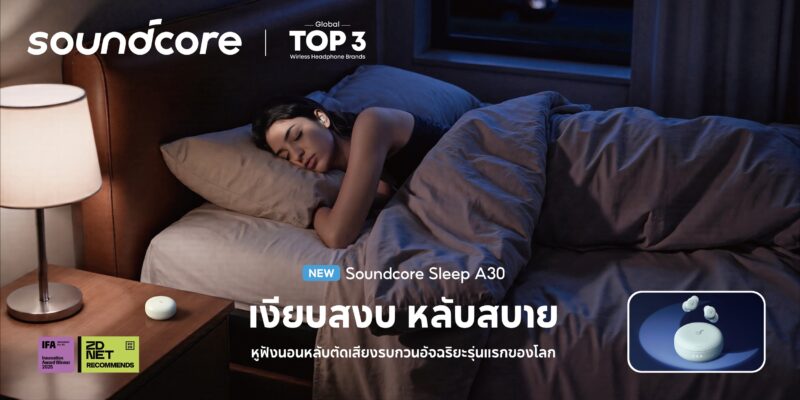 Soundcore Sleep A30 เปิดตัวอย่างเป็นทางการเมื่อวันที่ 10 ตุลาคม 2568 ที่ผ่านมา โดยออกแบบมาเพื่อผู้ที่มีปัญหานอนไม่หลับ ผู้ที่นอนตะแคง และผู้ที่ต้องเผชิญกับสิ่งรบกวนในยามค่ำคืน ด้วยการผสานเทคโนโลยีการตัดเสียงรบกวนแบบแอคทีฟและพาสซีฟเข้ากับเสียงบำบัดที่ขับเคลื่อนด้วย AI เพื่อช่วยให้ผู้ใช้นอนหลับได้เร็วขึ้นและหลับสนิทยาวนานขึ้น ก่อนเปิดตัว Sleep A30 สามารถระดมทุนผ่าน Kickstarter ได้กว่า 3 ล้านดอลลาร์สหรัฐ จากผู้สนับสนุนเกือบ 19,000 ราย สร้างสถิติใหม่ในกลุ่มผลิตภัณฑ์หูฟัง และล่าสุดยังได้รับรางวัล IFA Innovation Award 2025 ซึ่งตอกย้ำพันธกิจของ Soundcore ในการยกระดับคุณภาพการพักผ่อนผ่านเทคโนโลยีและการออกแบบที่คำนึงถึงผู้ใช้งานเป็นศูนย์กลาง