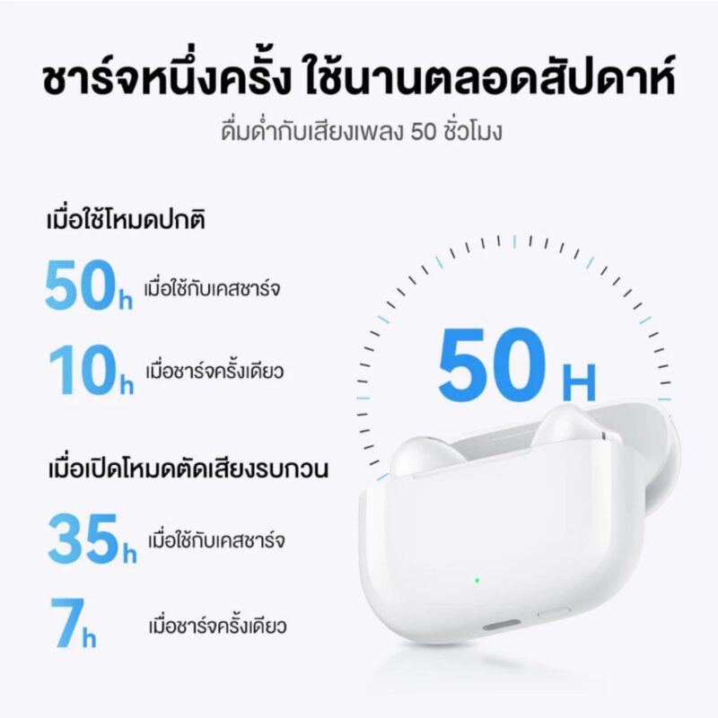 หมดกังวลเรื่องแบตเตอรี่หมดระหว่างวัน มาพร้อมแบตเตอรี่ที่ออกแบบมาเป็นพิเศษให้ใช้งานได้ยาวนาน สามารถเล่นเพลงได้ต่อเนื่องสูงสุด 10 ชั่วโมงต่อการชาร์จเต็มหนึ่งครั้ง และรองรับการใช้งานได้สูงสุดถึง 50 ชั่วโมงเมื่อใช้ร่วมกับเคสชาร์จ และหากต้องการใช้งานเร่งด่วน ก็มีฟังก์ชันชาร์จไวที่เพียงแค่ชาร์จ 10 นาทีก็สามารถใช้งานได้นานถึง 4 ชั่วโมง ให้คุณพร้อมสำหรับทุกกิจกรรมตลอดวัน