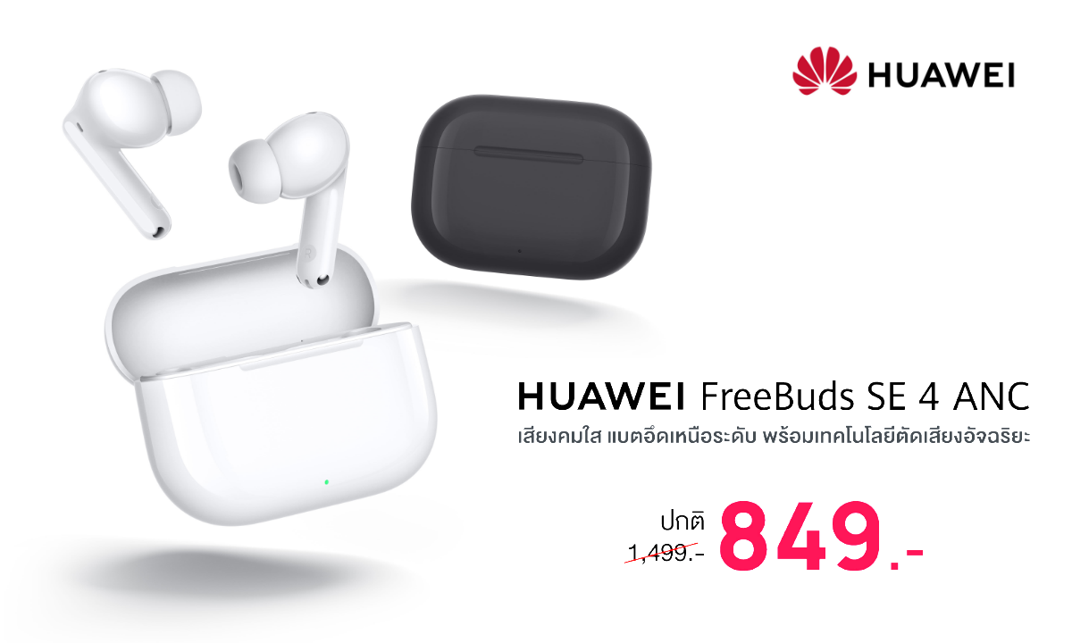 เตรียมพบกับ HUAWEI FreeBuds SE4 ANC หูฟังไร้สายรุ่นใหม่ล่าสุด ที่มอบพลังเสียงระดับเรือธง ในราคาที่คาดไม่ถึง อัดแน่นด้วยฟีเจอร์เด่น ทั้งเทคโนโลยีตัดเสียงรบกวนอัจฉริยะ แบตเตอรี่อึดทน และดีไซน์เบาสบาย ตอบโจทย์ไลฟ์สไตล์คนรุ่นใหม่ที่มองหาความคุ้มค่าและประสิทธิภาพเหนือระดับ พิเศษ! เตรียมพบกับราคาโปรโมชันเปิดตัวเพียง 849 บาท จากราคาปกติ 1,499 บาท พร้อมของสมนาคุณมากมาย และวอเชอร์ส่วนลดพิเศษจากร้านค้าช่องทางออนไลน์