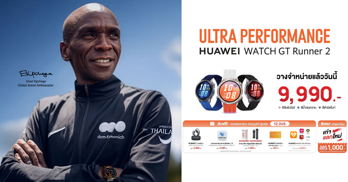 HUAWEI WATCH GT Runner 2 สมาร์ทวอทช์ที่เข้าใจทั้งจังหวะการเคลื่อนไหว และจังหวะชีวิต วางจำหน่ายแล้วในราคา 9,990 บาท พิเศษ! รับทันทีของสมนาคุณมูลค่ารวมสูงสุดกว่า 12,249 บาท ได้แก่ หูฟัง HUAWEI FreeArc (คละสี จำนวนจำกัด) มูลค่า 3,990 บาท, สิทธิ์ HUAWEI Care+ ขยายเวลารับประกันเพิ่มเติม 1 ปี พร้อมคุ้มครองความเสียหายจากอุบัติเหตุ (2 ครั้งใน 2 ปี) มูลค่า 2,990 บาท, สายนาฬิกาฟลูออโรอีลาสโตเมอร์ (แถมภายในกล่อง จำนวน 1 เส้น) มูลค่า 1,499 บาท, สิทธิ์ HUAWEI Health+ Membership (ระยะเวลา 3 เดือน) มูลค่า 357 บาท และสิทธิ์ HUAWEI Health MultiPass ทดลองใช้บริการระดับพรีเมียม ฟรีสูงสุด 90 วัน มูลค่ารวมสูงสุด 3,413 บาท (จำกัดระยะเวลาการรับสิทธิ์ตั้งแต่ 13 มีนาคม 2569 – 31 ธันวาคม 2569) พิเศษ! ลูกค้าเก่ารับทันทีสิทธิ์เก่าแลกใหม่รับส่วนลดเพิ่มสูงสุด 1,000 บาท เมื่อนำสมาร์ทโฟนหรือแท็บเล็ตหัวเว่ยเครื่องเก่ามาแลกเป็นส่วนลด โดยโปรโมชั่นนี้สำหรับผู้ที่สั่งซื้อระหว่างวันที่ 13 มีนาคม 2569 ถึง 12 เมษายน 2569 ผ่านหน้าร้าน HUAWEI Experience Store และร้านค้าตัวแทนจำหน่ายที่ร่วมรายการ และช่องทางออนไลน์ทั้ง HUAWEI Store, Lazada, Shopee และ TikTok Shop