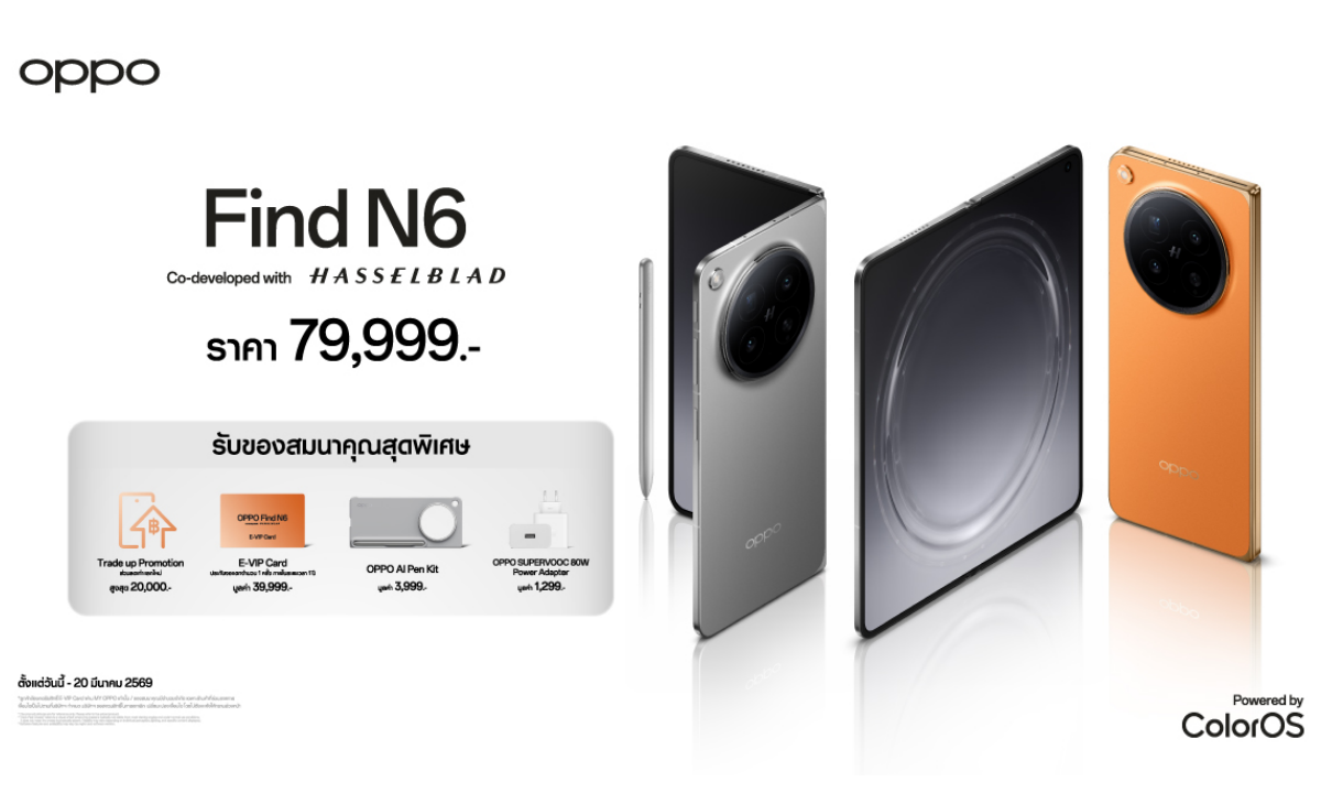 OPPO ประกาศวางจำหน่าย “OPPO Find N6” สมาร์ตโฟนจอพับรุ่นใหม่ล่าสุด ที่มาพร้อมกับสโลแกน “เรียบกว่า อิสระกว่า ทรงพลังทุกมิติ” ครั้งแรกของอุตสาหกรรม กับรอยพับที่แทบมองไม่เห็น อย่างเป็นทางการในประเทศไทย ในราคา 79,999 บาท ผ่าน OPPO Brand Shop และตัวแทนจำหน่ายทั่วประเทศ วางจำหน่ายวันที่ 21 มีนาคม 2569 เป็นต้นไป และสำหรับผู้ที่ซื้อ OPPO Find N6 ระหว่างวันที่ 21 มีนาคม 2569 – 30 เมษายน 2569 จะได้รับของสมนาคุณรวมมูลค่า 45,297 บาท พร้อมบริการ Premium Service สัมผัสประสบการณ์การดูแลระดับพรีเมียมจาก OPPO อย่างเต็มรูปแบบ และโปรโมชันสุดพิเศษ โปรโมชัน Trade-up เก่าแลกใหม่
