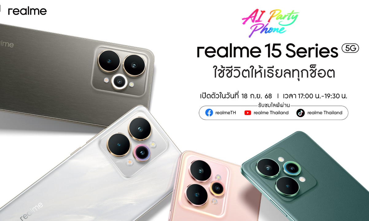เตรียมพบกับปรากฏการณ์ครั้งใหม่! เมื่อ realme แบรนด์สมาร์ตโฟนเพื่อคนรุ่นใหม่ที่เติบโตเร็วที่สุดในโลก พร้อมสร้างสีสันอันน่าตื่นตาให้กับวงการมือถืออีกครั้งกับการเปิดตัว “realme 15 Series 5G” ที่มาพร้อมกันถึง 3 รุ่น ได้แก่ realme 15 Pro 5G, realme 15 5G ซีรีส์ใหม่นี้ยกระดับประสบการณ์สมาร์ตโฟนด้วยสมญานาม “AI Party Phone” ภายใต้การเป็น “Your Colorful Partners” ที่มาพร้อมดีไซน์สีสันสดใส ออกแบบมาเพื่อเป็นเพื่อนคู่ใจในทุกโมเมนต์ของชีวิต ให้คุณสนุกได้เต็มที่ทั้งการทำงาน ความบันเทิง และปาร์ตี้สุดมันส์ อีกทั้งยังโดดเด่นด้วย แบตเตอรี่ Titan ขนาด 7,000 mAh ที่บางที่สุดในเซ็กเมนต์ ผสานความบางเบา สีสันสดใส และพลังทรงประสิทธิภาพไว้อย่างลงตัว