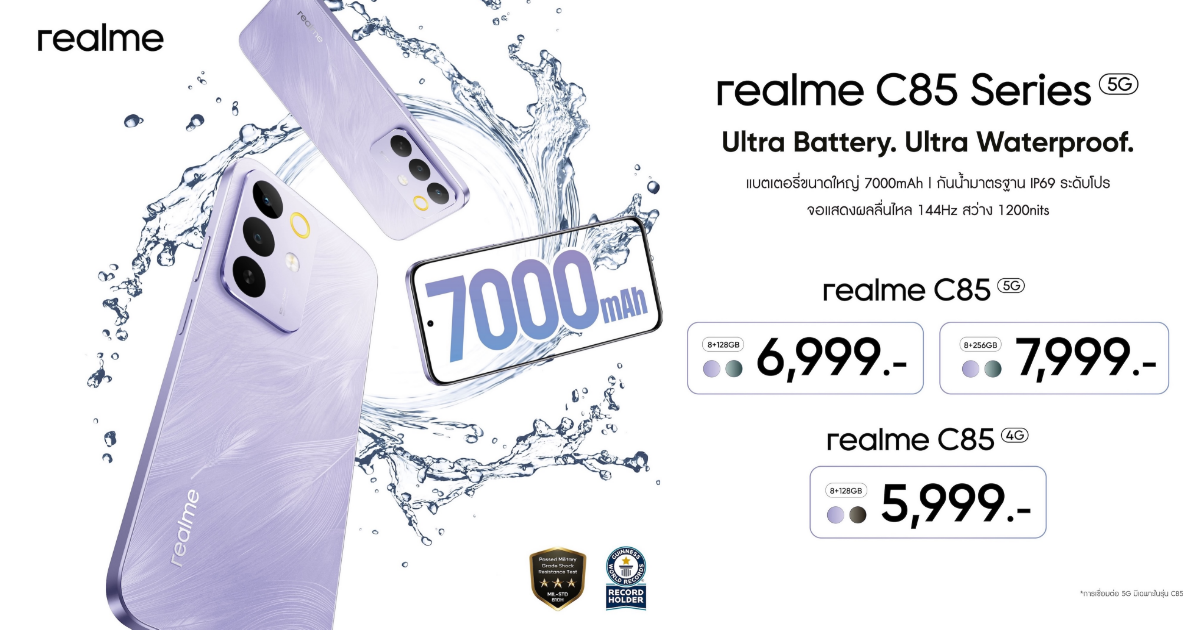 realme ประกาศราคา “realme C85 Series 5G” ในประเทศไทยอย่างเป็นทางการ พร้อมเขย่าวงการมือถือระดับเริ่มต้นด้วยเทคโนโลยีสุดล้ำ Ultra Battery x Ultra Waterproof ตอบโจทย์การใช้งานทุกสถานการณ์ นำเสนอทั้งรุ่น 5G และ 4G ในราคาเริ่มต้นเพียง 5,999 บาท พร้อมเผยโฉม “realme Buds Clip” หูฟังแบบคลิปดีไซน์ล้ำสมัยสำหรับผู้ใช้งานรุ่นใหม่ที่ต้องการความมั่นคง เบาสบาย และใส่ได้นานโดยไม่ระคายหู พร้อมเปิดให้แฟน ๆ ได้จับจองกันผ่านช่องทางการจัดจำหน่ายอย่างเป็นทางการ realme Brand Shop ศูนย์จำหน่ายสมาร์ตโฟนชั้นนำ และแพลตฟอร์มร้านค้าออนไลน์ได้ตั้งแต่วันที่ 28 พฤศจิกายนเป็นต้นไป