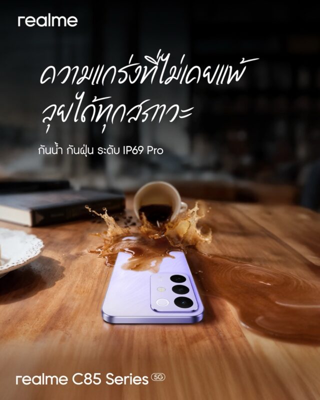 เปิดตัวนวัตกรรมความทนทานล่าสุด “IP69 Pro Water Resistance” อย่างเป็นทางการ โดยเริ่มใช้ครั้งแรกบน realme C85 Series 5G สมาร์ตโฟนรุ่นใหม่ที่มาพร้อมระบบป้องกันน้ำขั้นสูงสุดของแบรนด์ นับเป็นก้าวสำคัญในการยกระดับมาตรฐานความทนทานให้กับสมาร์ตโฟนในกลุ่ม C Series ทำให้ผู้ใช้รุ่นใหม่มั่นใจได้ในทุกสถานการณ์การใช้งาน