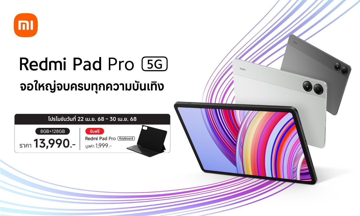 เสียวหมี่ ประเทศไทย วางจำหน่าย Redmi Pad Pro 5G แท็บเล็ตหน้าจอใหญ่ที่จบครบทุกความบันเทิงพร้อมการเชื่อมต่อ 5G โดยวางจำหน่ายในรุ่นความจุ 8GB+128GB ราคา 13,990 บาท ที่ Xiaomi Store และร้านตัวแทนจำหน่ายที่ร่วมรายการ รวมถึงช่องทางการจัดจำหน่ายทางออนไลน์แพลตฟอร์ม พิเศษ! สำหรับลูกค้าที่ซื้อสินค้าระหว่างวันที่ 22 – 30 เมษายน 2568 รับฟรี! Redmi Pad Pro Keyboard มูลค่า 1,999 บาท1