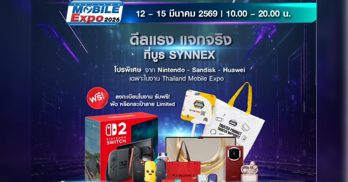 บริษัท ซินเน็ค (ประเทศไทย) จำกัด (มหาชน) หรือ SYNNEX ผู้นำด้านการจัดจำหน่ายสินค้าไอทีครบวงจร ขนทัพสินค้าไอที สมาร์ทดีไวซ์ และแก็ดเจ็ตจากพันธมิตรแบรนด์ระดับโลก จัดเต็มโปรโมชันสุดคุ้ม และพบกับกิจกรรมสุดเอ็กซ์คลูซีฟ ในงาน Thailand Mobile Expo 2026 รับฟรี! พัด หรือกระเป๋าลาย Limited จำนวนจำกัด เพียงลงทะเบียน SYNNEX Membership เอาใจสายไอทีให้ช้อปกันอย่างจุใจตอบโจทย์ไลฟ์สไตล์ดิจิทัลยุคใหม่