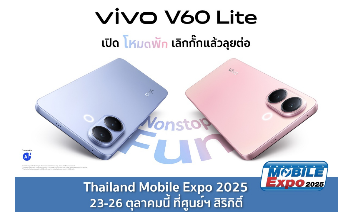 vivo พร้อมพาทุกคนก้าวข้ามทุกสถานการณ์ที่กั๊กความสนุกในชีวิต ด้วยการนำเสนอสมาร์ตโฟนรุ่นใหม่ล่าสุด vivo V60 Lite ภายใต้แนวคิด “เปิดโหมดพัก เลิกกั๊ก แล้วลุยต่อ” ที่ออกแบบมาเพื่อตอบโจทย์ไลฟ์สไตล์คนรุ่นใหม่ที่ต้องการใช้งานสมาร์ตโฟนในการพักผ่อน เพื่อหลีกหนีจากสิ่งที่ทำต่อเนื่องตลอดทั้งวัน ไม่ว่าจะเป็นการ ‘พักชาร์จ‘ แบตเตอรี่ ‘พักงาน‘ เพื่อรีบูตสมอง หรือ ‘พักเล่น‘ เกม ก็สามารถทำได้อย่างเต็มที่ด้วยประสิทธิภาพที่ให้มาแบบ “ไม่กั๊ก” เตรียมส่งมอบถึงมือผู้ใช้งานชาวไทยอย่างเป็นทางการ วันที่ 18 ตุลาคม 2568 นี้!