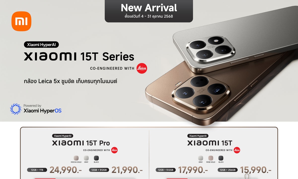 เสียวหมี่ ประเทศไทย วางจำหน่าย Xiaomi 15T Series สมาร์ทโฟนเรือธงที่มอบนวัตกรรมเทคโนโลยีมือถือขั้นสูงพร้อมภาพที่เหนือชั้นและการออกแบบที่ประณีต ในราคาเริ่มต้น 21,990 บาท และ Xiaomi Pad Mini แท็บเล็ตมินิเรือธงรุ่นแรกของเสียวหมี่ในตลาดโลก ในราคาเริ่มต้น 12,990 บาท อย่างเป็นทางการในประเทศไทย พร้อมโปรโมชันพิเศษตลอดเดือนตุลาคม 2568