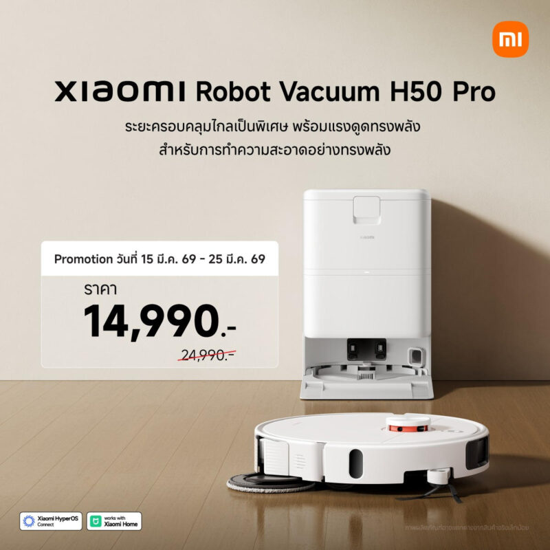 หุ่นยนต์ดูดฝุ่น Xiaomi Robot Vacuum H50 Pro วางจำหน่ายในราคาพิเศษ 14,990 บาท2 (จากราคาปกติ 24,990 บาท) ตั้งแต่วันนี้ ถึง 25 มีนาคม 2569 ที่ Xiaomi Store และร้านตัวแทนจำหน่ายที่ร่วมรายการทั่วประเทศ รวมถึงช่องทางการจัดจำหน่ายทางออนไลน์แพลตฟอร์ม mi.com และ Lazada2