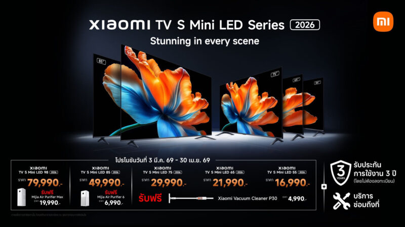 ทีวีอัจฉริยะ Xiaomi TV S Mini LED 2026 มีขนาดหน้าจอให้เลือก 5 ขนาด ได้แก่ 55 นิ้ว, 65 นิ้ว, 75 นิ้ว, 85 นิ้ว และ 98 นิ้ว โดยขนาด 55 นิ้ว วางจำหน่ายในราคาเริ่มต้นที่ 16,990 บาท พิเศษ! ลูกค้าที่ซื้อสินค้าตั้งแต่วันนี้ ถึง 30 เมษายน 2569 รับฟรี Xiaomi Vacuum Cleaner P30 มูลค่า 4,990 บาท2 ที่ Xiaomi Store และร้านตัวแทนจำหน่ายที่ร่วมรายการทั่วประเทศ รวมถึงช่องทางการจัดจำหน่ายทางออนไลน์แพลตฟอร์ม mi.com และ Lazada2