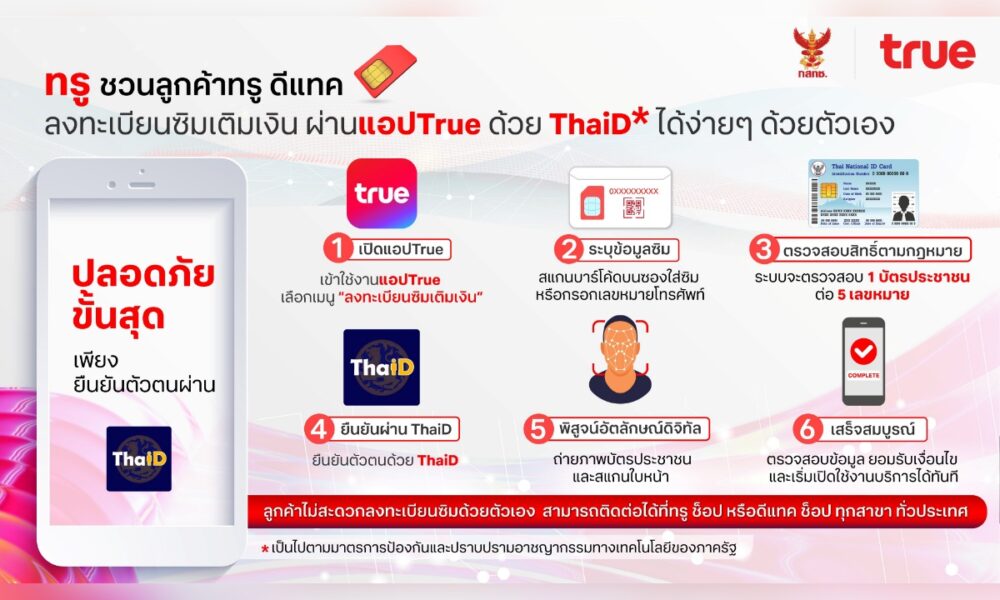 True ยกระดับความปลอดภัยการลงทะเบียนซิมขั้นสุด เปิดให้ลูกค้าลงทะเบียนซิมเติมเงินด้วยตัวเองผ่านแอปทรูด้วย ThaiD มั่นใจ ใช้งานง่าย และเชื่อถือได้