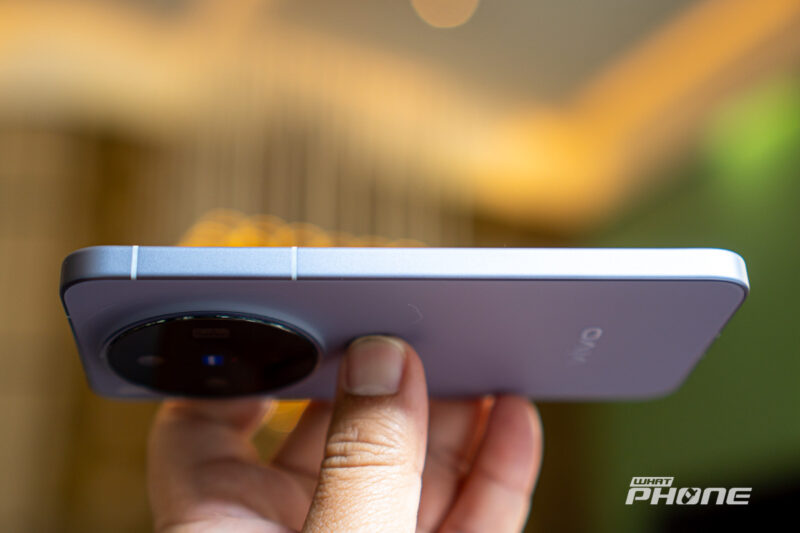ด้านหลังของเครื่องที่เราได้มาทดสอบเป็นสี Irish Purple หรือสีม่วงอ่อนๆ หากมองในบางมุมจะเห็นเป็นสีเทาอ่อนๆ ได้เช่นกัน ดีไซน์กล้องเป็นแบบวงแหวนมินิมอล รวมเอาเลนส์กล้องทั้งหมดอยู่ในที่เดียว พร้อมโลโก้ ZEISS T* อยู่ตรงกลาง